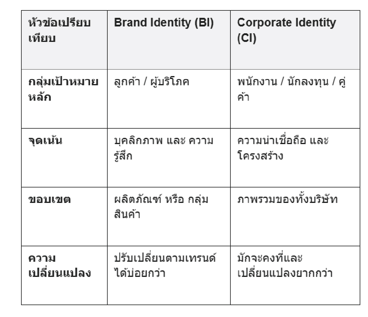 เป้าหมายหลัก: เพื่อสร้าง “ความเชื่อมั่น” (Trust) การมี CI ที่แข็งแรงจะยืนยันว่าบริษัทนี้มีความมั่นคง มีธรรมาภิบาล และเป็นองค์กรที่น่าร่วมธุรกิจด้วยในระยะยาว